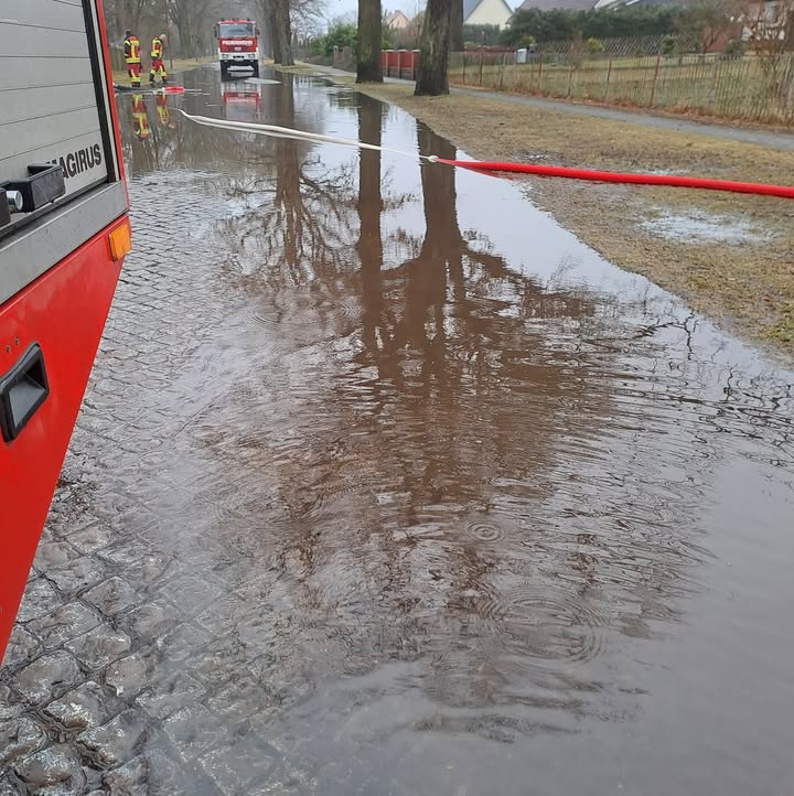 Vor Ort bestätigte sich die Lage. Aufgrund der aktuellen Wetterlage und Schneeschmelze war die komplette Straße überflutet und drohte auf Privatgrundstücke überzulaufen. Wir begannen umgehend mittels Schmutzwasserpumpen die Fahrbahn abzupumpen. Nach etwa 3 Stunden stellten wir die Einsatzbereitschaft wieder her.